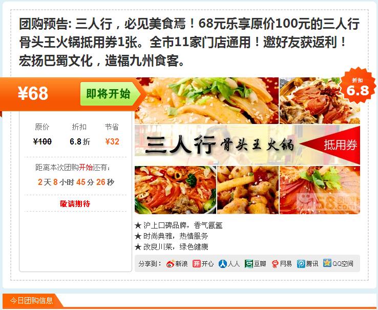 三人行,必見美食焉!68元樂享原價100元的三人行骨頭王火鍋抵用券1張。全市11家門店通用!邀好友還獲返利!最新活動